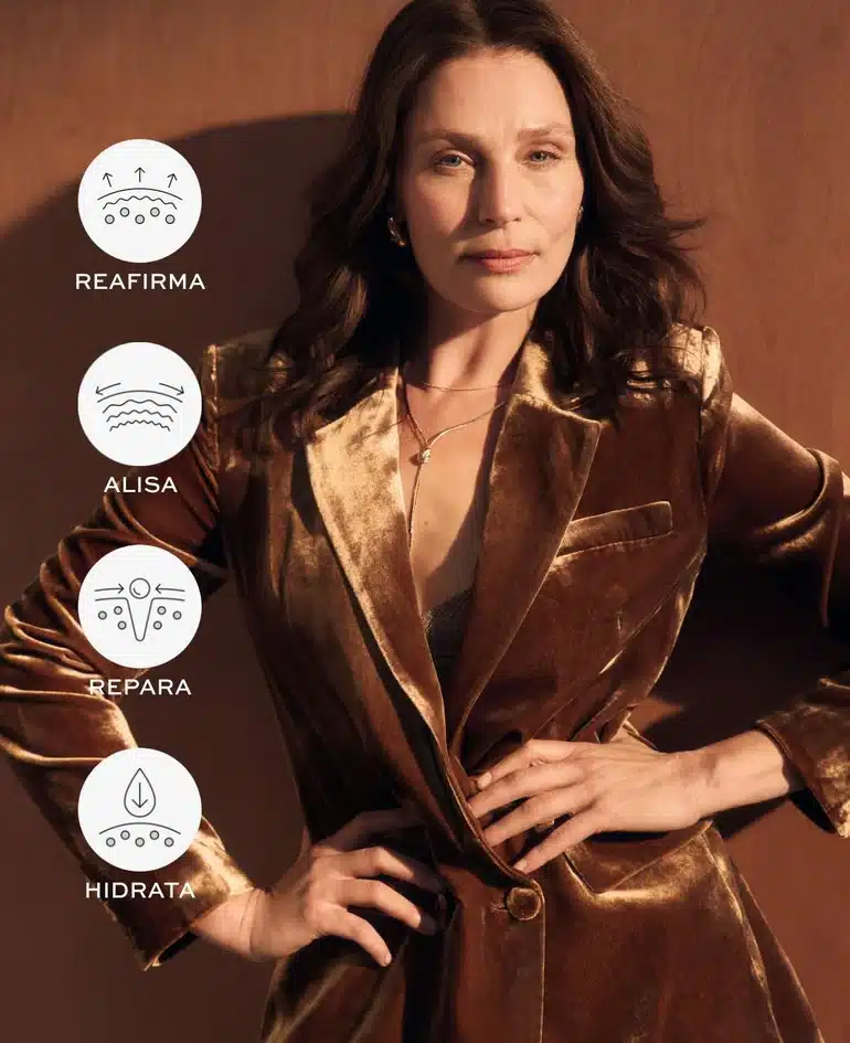 Además incorpora activos antioxidantes, Matrixyl, proteoglicanos, prebióticos y pro‑vitamina D para fortalecer la barrera cutánea, mejorar la elasticidad y unificar el tono.